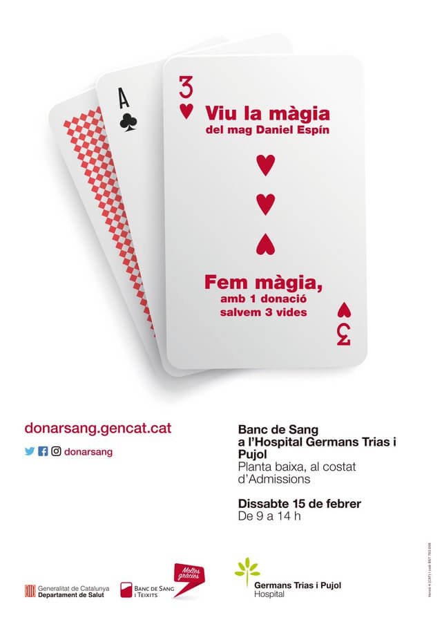 Aquest dissabte, 15 de febrer, el Banc de Sang i Teixits de l’Hospital Germans Trias i Pujol proposa una iniciativa original, coincidint amb el Festival de Màgia. Durant el matí, de 9h a 14h, actuarà en directe el mag Daniel Espín, que oferirà trucs de màgia a les persones que donin sang. Amb aquesta iniciativa, el banc de sang vol apropar més donants.