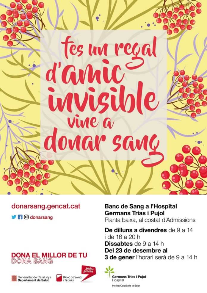 Fes un regal d’amic invisible. Amb aquest missatge el Banc de Sang i Teixits de l’Hospital Germans Trias i Pujol de Badalona vol engrescar el màxim nombre de persones a donar al més aviat possible. Per aquesta raó, el Banc de Sang ha organitzat una campanya de donació amb horari especial fins el 23 de desembre, de dilluns a divendres de 9h a 14h i de 16h a 20h, i els dissabtes de 9h a 14h. Del 23 de desembre al 3 de gener l’horari serà de 9h a 14h, entremig de les festes de Nadal, Sant Esteve i Any Nou.