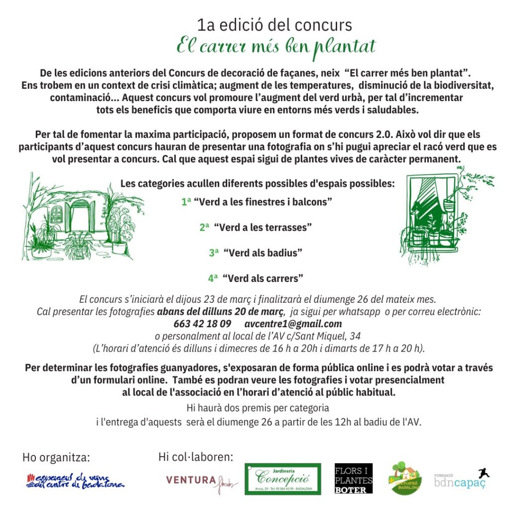 Fa uns anys l’associació organitzava el Concurs de façanes. Enguany, l’Associació Veïnal del Centre li han donat una volta i presenten la 1a edició del concurs “El carrer més ben plantat”. Forma part del projecte Badalona Inspira i es farà la setmana del 20 de març, coincidint amb l’inici de la primavera.