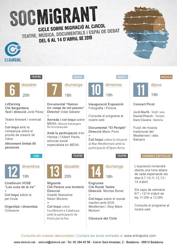 El proper mes d’abril el Círcol prepara un nou cicle centrat en la migració sota el títol #SocMigrant del 6 al 14 d’abril. Des del Círcol i a partir de les arts escèniques volen crear un espai de reflexió, per a la difusió de projectes, per compartir experiències, i per poder apropar més a la realitat de la migració; persones, que fugen del seu país buscant un futur, una vida. El cicle, que ja s’ha presentat, proposa teatre, documentals, xerrades, música i una exposició. Podeu consultar el programa complet al següent enllaç; https://elcircol.cat/socmigrant/socmigrant.html