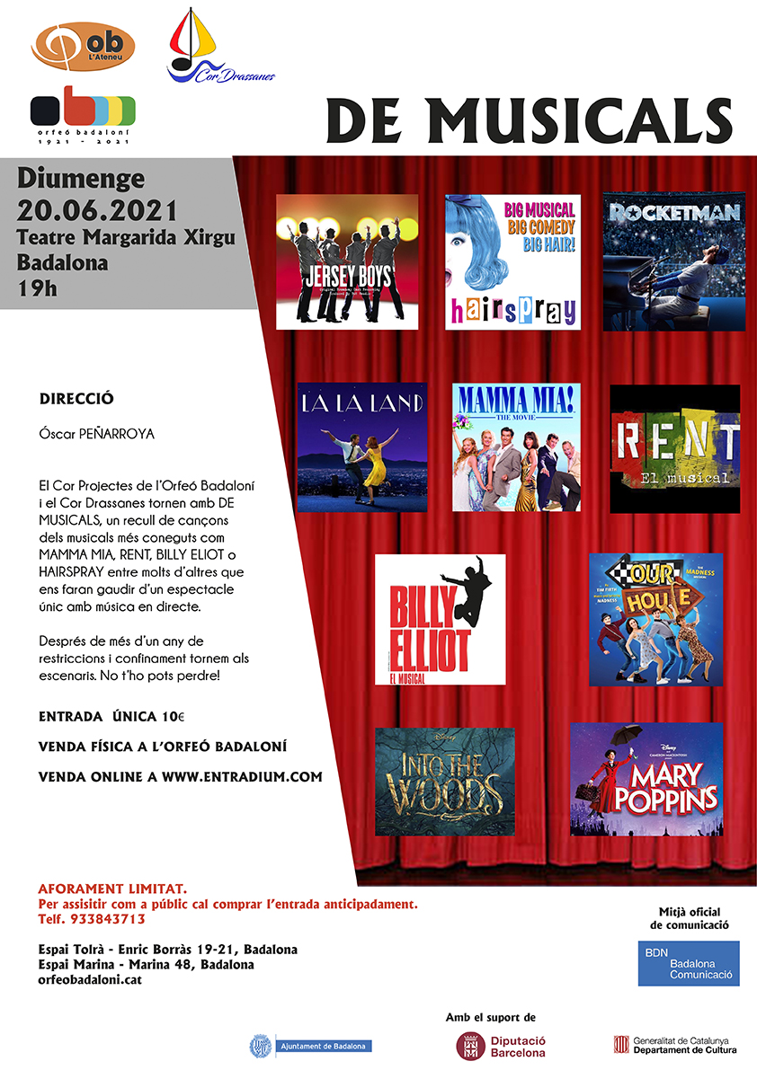 L’alleugeriment de les restriccions que el coronavirus ha imposat a la cultura permet que aquest diumenge 20 de juny a les set de la tarda el Cor de Projectes de l’Orfeó Badaloní Ateneu torni als escenaris de Badalona. El cor ho fa amb una actuació conjunta amb el Cor Drassanes de Barcelona al Teatre Margarida Xirgu (Carrer de Francesc Layret, 41) de Badalona, on interpretaran alguns dels temes més coneguts del cinema i el teatre musical. Són temes, d’entre altres, les pel·lícules Hairspray; Waitress; Memphis; Lalaland; Into the woods; Mary Poppins; Our House; Newsies; Rent; Mamma Mia; Spring Awakening; Something Rotten; Rocketman; We will rock you; Jersey Boys; i Billy Elliot. Una part de les cançons es canten en la versió original (en anglès) i una altra amb una traducció en català que s’ha fet especialment per a aquest espectacle.