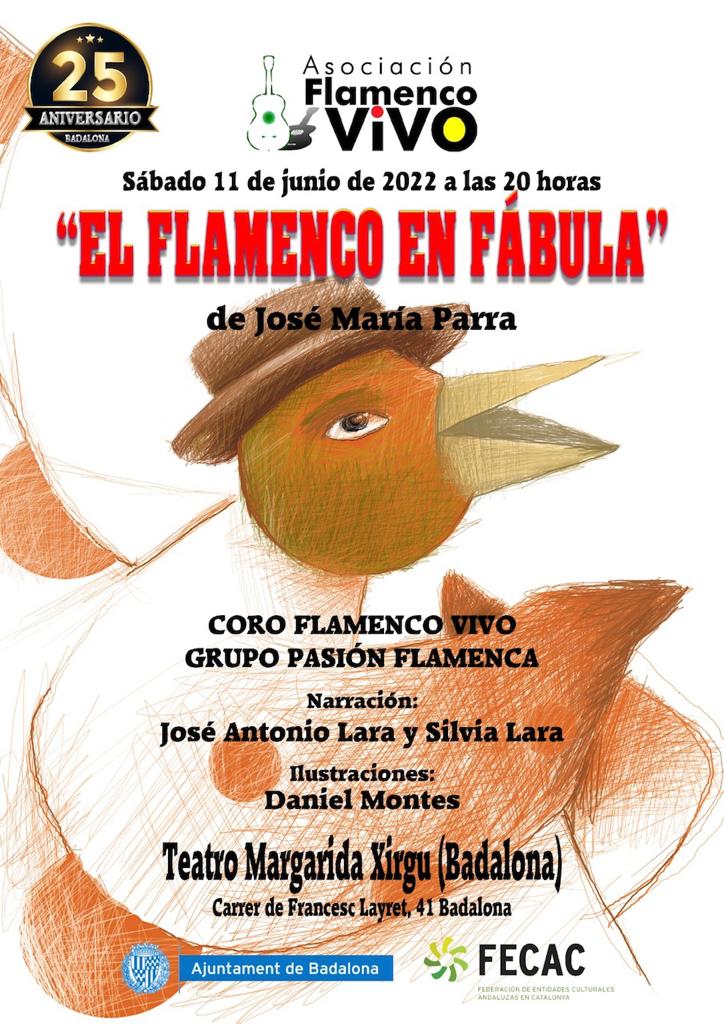 El dissabte dia 11 de juny, a les 20 hores, es presentarà al Teatre Margarida Xirgu de Badalona “El Flamenco en Fábula”, a càrrec de l’associació Flamenco Vivo. “Flamenco en Fábula” és una obra de José Maria Parra que narra la història a través d’un conte que segueix la cronologia de les diferents etapes del flamenc, a més d’aprofundir en els inicis de la seva existència. Els protagonistes d’aquest real són dos ocells que canten i s’expressen de maneres molt diferents, que adopten formes i colors dispars els quals els poden identificar.