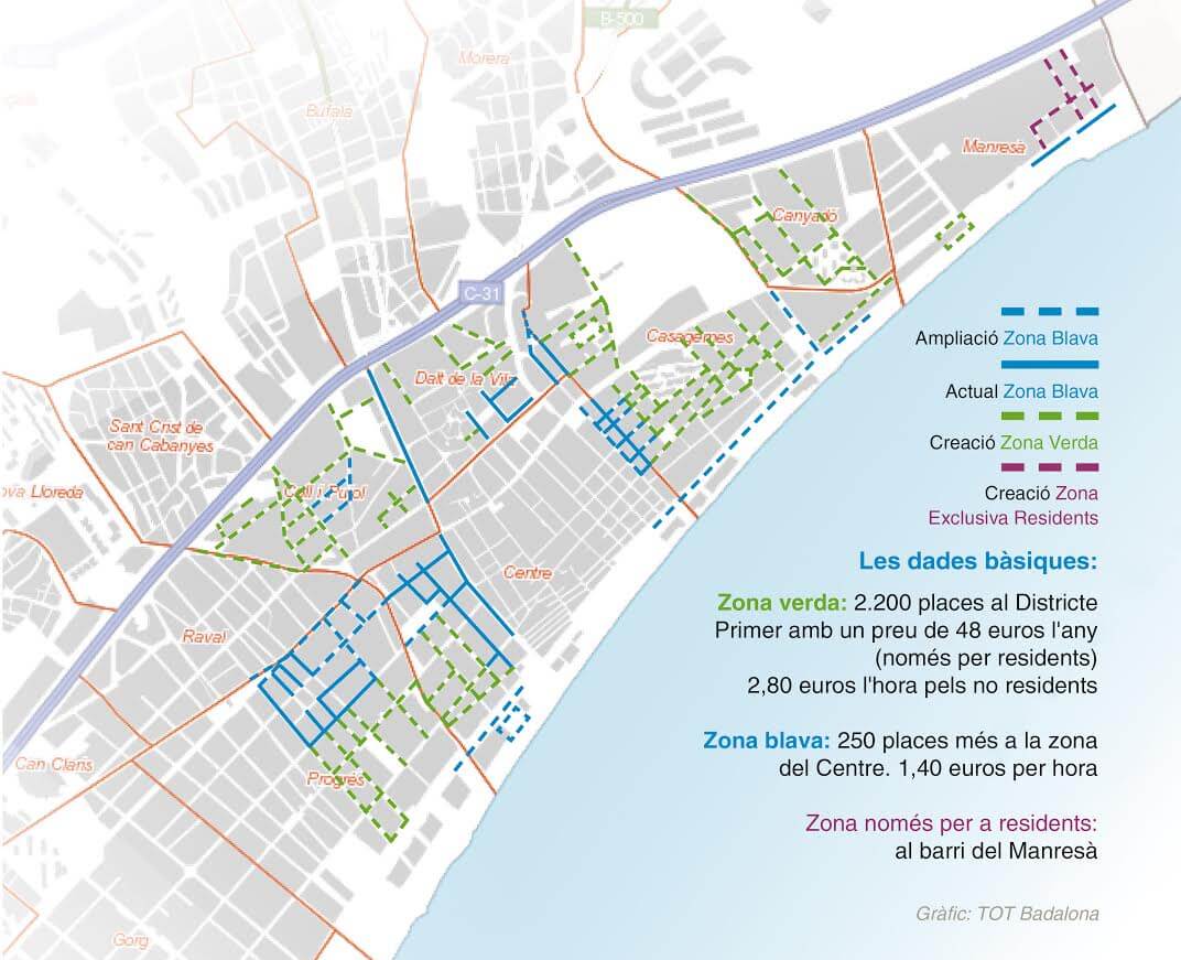 La zona verda és previst que es desplegui a Badalona amb 2.200 places al llarg del Districte 1, les quals tindran una tarifa anual de 48 euros per als residents, i un cost de 2,80 euros per hora per a la resta de vehicles. En el cas del barri del Manresà, es planifica una àrea exclusiva només per als veïns, on hi haurà un centenar de places.