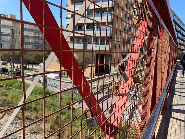 La moda de penjar cadenats a ponts o estructures de ferro s’estén per tot el món. Potser fa uns anys semblava una moda, però ara s’ha demostrat que no. En moltes ciutats troben ponts amb milers de cadenats, on darrere de cada un d’ells s’amaga una història, sobretot d’amor. A Badalona, fa uns anys, els enamorats tenien el seu indret; el Pont del Petroli. Allà s’hi van acumular centenars de cadenats. L’Ajuntament va decidir retirar-los, sobretot perquè ràpidament quedaven rovellats, i alertar que aquell no era l’indret més adient per penjar-los. Des de fa temps, els que volen deixar penjada del seu amor han trobat un altre punt a la ciutat. Es tracta del punt vermell, situat davant la CACI fins a la plaça del Vaixell Maria Assumpta. Moltes parelles deixen els seus cadenats, amb els noms dels dos, en aquests cadenats penjats al pont vermell, alguns ja molt rovellats pel pas del temps.