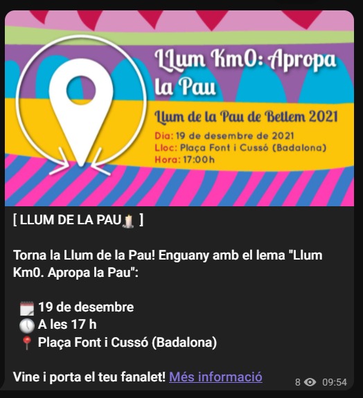 La Llum de la Pau de Betlem és un projecte escolta i guia internacional que ens convida a compartir la Llum com a símbol de pau. Es tracta d’una flama que els Escoltes i Guies d’Àustria encenen a Betlem i, des d’allà, s’escampa pel món gràcies als escoltes i les guies que la van compartint, simbolitzant la pau que esperem que arribi a tots els racons del nostre planeta.