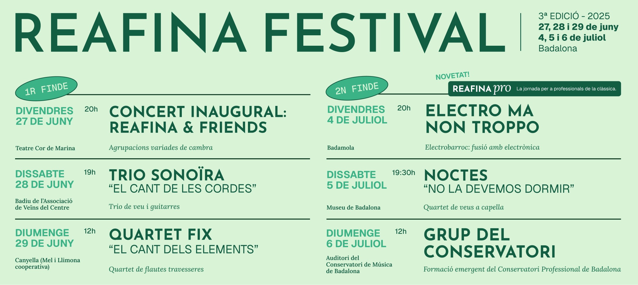 Badalona tornarà a vibrar amb la música clàssica amb la tercera edició del Reafina Festival, que se celebrarà els caps de setmana del 27, 28 i 29 de juny i del 4, 5 i 6 de juliol. El festival aposta per apropar la música clàssica a la ciutat amb una programació variada, espais singulars i propostes fresques.
