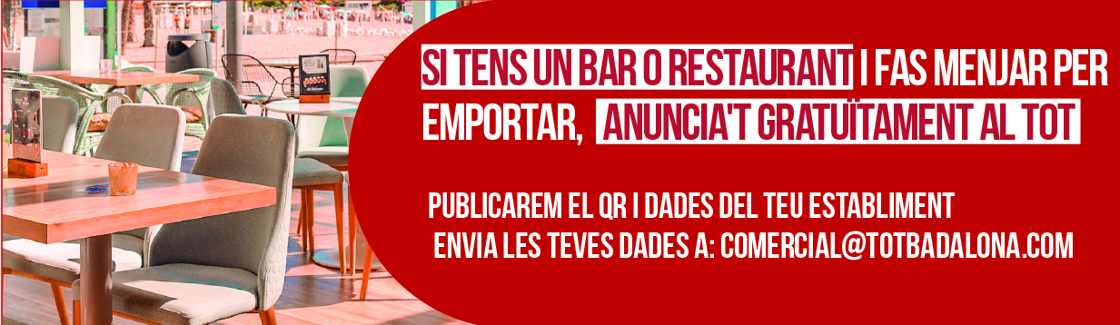 La Revista El TOT Badalona dedicarà, en l’edició del pròxim 27 de novembre, un espai gratuït als bars i restaurants de la ciutat que ofereixen menjar per emportar. El TOT publicarà el nom de l’establiment, el logo i un codi QR perquè els lectors puguin conèixer la carta/menú del local badaloní.