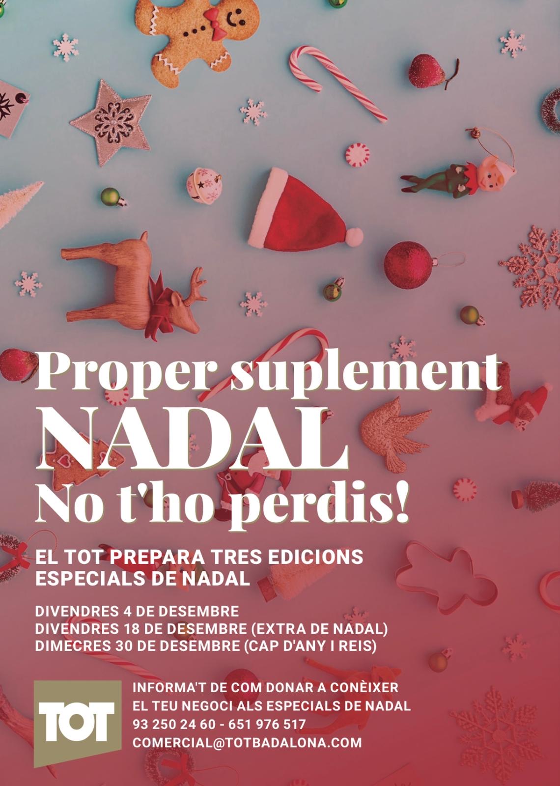 La Revista El TOT Badalona està ja preparant els seus especials de Nadal, enguany amb tres edicions que sortiran al carrer els dies 4 de desembre, 18 de desembre i 30 de desembre. Com sempre, dins d’aquestes edicions s’està preparant l’Extra de Nadal que sortirà al carrer el 18 de desembre. Enguany, el TOT vol oferir unes ofertes especials als comerciants i negocis que vulguin aparèixer als nostres especials. Si voleu més informació, sense cap compromís, us podeu posar en contacte amb el nostre departament comercial al telèfon 651.976.517 (també WhatsApp). També per correu: [email protected]. Els especials de Nadal tindrà diversos reportatges, entrevistes i imatges de relacionades amb les festes i una alta representació del comerç local.