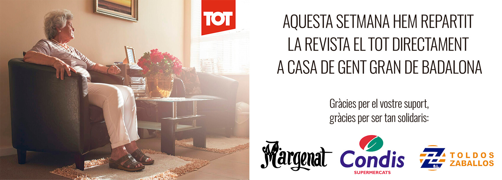Aquest divendres, 20 de març, la Revista El Tot tornarà a estar al carrer, com cada setmana, en una edició dedicada a l’actual crisi del coronavirus. El confinament i el fet que molts establiments estiguin tancats ha fet sorgir una proposta per tal de fer arribar 100 exemplars del TOT a casa de persones grans de Badalona. Gràcies al suport de Condis, Xarcuteries Margenat i Toldos Zaballo farem arribar aquests exemplars a persones grans de tres barris de la ciutat. De moment, aquesta setmana, començarem el repartiment als barris del Centre, Casagemes i Progrés. Si coneixeu algun familiar o amic/amiga, major de 70 anys, ens podeu fer arribar un WhatsApp al número del TOT, 651.97.65.17. Les primeres 100 peticions, de veïns majors de 70 anys del Centre, Casagemes i Progrés rebran el TOT a casa, a partir de divendres. Cal dir que la distribució es farà en la màxima seguretat higiènica, i a més, en gairebé totes les ocasions es deixarà la revista a la bústia o bé sota la porta. La intenció del mitjà és poder repetir en pròximes setmanes l’experiència en més barris de Badalona. D’altra banda, el TOT serà divendres a tots els punts habituals que restin oberts durant aquest estat d’alarma.