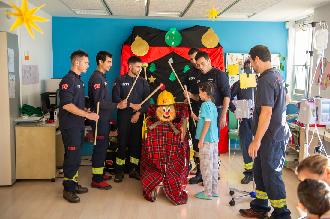 Els bombers han visitat la Unitat d’Hospitalització de Pediatria, on han realitzat una gran activitat conjunta amb la canalla. Entre tots, han fet cagar el Tió de Nadal, a cop de bastó i fent sonar la cançó típica d’aquesta tradició catalana. Després d’uns quants cops, i gràcies a que els bombers han alimentat molt bé el tió durant aquests dies, els nens i nenes han rebut diferents obsequis: un llibre, gràcies a la llibreria de Badalona Saltamartí Llibres, i un clauer dels bombers, format per un casc dels que utilitzen habitualment.