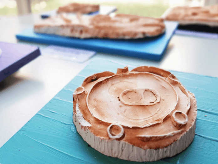 Per treballar aquest concepte, la canalla s’ha inspirat en paisatges on la brutícia i la fauna cohabiten, i han creat fòssils marins, utilitzant fang, guix i diferents objectes que podem trobar sota l’aigua. Les peces estan exposades al vestíbul de consultes externes.