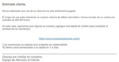 Els Mossos d’Esquadra i Endesa han alertat d’una estafa on se suplanta el nom de la companyia a través de correus electrònics. Segons ha informat el cos policial en un comunicat, en aquests correus se suplanta la marca a través del mètode anomenat ‘phishing’, amb l’objectiu d’enganyar els ciutadans i intentar obtenir les seves dades persones, el número de compte bancari o el de les targetes de crèdit. A més, també han detectat correus que informen d’un fals problema amb el pagament d’una factura per introduir virus als dispositius dels usuaris. A més de correus electrònics, també s’utilitzen missatges de WhatsApp amb el logo de la companyia.