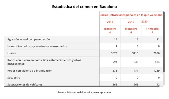 Els robatoris amb força, en els quals es danyen elements materials, però no hi ha violència contra persones, a domicilis a Badalona es van reduir el 60,5% en l’any del confinament en comparació amb el 2019, segons les dades del Ministeri de l’Interior. Això significat que es va passar de 645 robatoris a cases el 2019 a 424 l’any passat. En l’àmbit general, els delictes a Badalona l’any passat van caure. Hi va haver 2.686 furts, gairebé 800 furts menys que el 2019. A la ciutat també baixen delictes com el tràfic de drogues, de 49 intervencions, el 2019, s’ha passat a 40 el 2020. Totes aquestes dades són publicades pel Ministeri d’Interior, tal com mostra el gràfic.