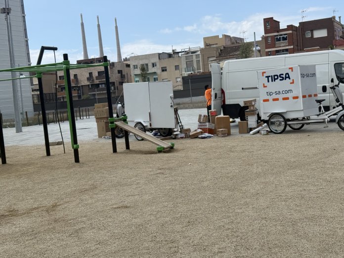 A la imatge, captada aquest matí, es pot veure com una empresa de repartiment opera a plena llum del dia, utilitzant un espai públic recentment urbanitzat per a activitats logístiques. Els repartidors, a més, deixen caixes i embalatges per terra, en un espai que hauria de ser de gaudi per a infants i veïns.