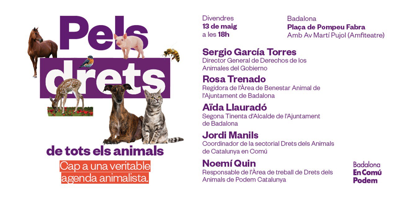 Aquest divendres a les 18 hores, En Comú Podem Badalona farà un acte “Pels drets de tots els animals”, que comptarà amb diferents representants de l’entitat morada com la Segona tinenta d’alcalde de l’Ajuntament de Badalona, Aïda Llauradó, el coordinador de la sectorials drets dels animals de Catalunya en Comú, Jordi Manils, entre molts d’altres.