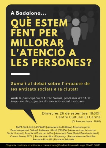 Aquest pròxim dimecres , 26 de setembre, a les 18.30 hores al Centre Cultural el Carme acollirà la Taula de debat oberta al públic: “Què estem fent per millorar l’atenció a les persones?”, convocada per 11 entitats socials de Badalona vinculades a la Fundació Roca i Pi.