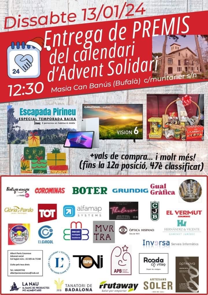 Aquest dissabte 13 de gener, a les 12:30h es fa entrega dels premis als millors classificats del Joc del Calendari d’Advent Solidari de Badalona que es va realitzar el passat mes de desembre. Serà als jardins de la fundació Acollida i Esperança – Can Banús, carrer Muntaner s/n (Bufalà). Hi haurà una primera part de Benvinguda per part de Josep Mª Lluch (director fundació Acollida i Esperança).Després en Josep Oncins (desenvolupador informàtic del joc) comentarà algunes dades estadístiques de participació i explicarà com es farà l’entrega i repartiment de premis.Posteriorment representants de les entitats i els patrocinadors aniran entregant els obsequis als guanyadors. I finalitzarem amb un aperitiu per tots. Cal destacar que gràcies a la generosa col.laboració dels esponsors, repartirem 47 regals corresponents als classificats fins la 12a posició amb els respectius empats. El primer premi és una “escapada al Pirineu de dues nits a mitja pensió + visita en jeep al parc Nacional d’Aigüestortes”. Els altres premis són diversos vals de compra o lots de productes de botigues de la ciutat, entrades pel teatre del Círcol, per la Penya, una TV, una tablet, dos pernils, dinar o sopar al restaurant l’Estupendu, dinar al restaurant Toni Tàpia…