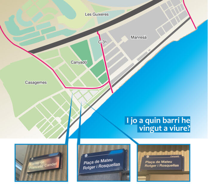 Badalona està urbanitzant noves zones, com per exemple al Gorg o a l’antiga zona del Cristall, al voltant de la part baixa de la Riera Canyadó. Aquí han nascut nous carrers, com Francesc Candel o la plaça de Mateu Rotger i Rosquellas. La zona la trobem dins del barri de Casagemes i no pas del barri de Canyadó, tal i com indiquen les plaques d’aquests nous carrers. L’Ajuntament ha admès al TOT que s’ha produït un error al posar el nom del barri en alguns punts per una “confusió”. De fet, algunes d’aquestes plaques han estat pintades per esborrar el nom del barri amb pintura blava. Fonts municipals han aclarit que s’han encarregat noves plaques per substituir-les de nou. De fet, en el plànol oficial de l’Ajuntament, on hi ha els límits dels barris, Canyadó no arriba a cap tram de platja i el seu límit, banda mar, s’acaba al carrer Pomar de Baix.