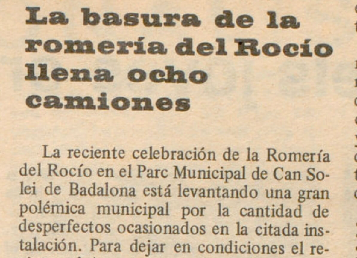 Aquest juny es compleixen 45 anys d’un dels episodis que va aixecar més polseguera al Badalona dels anys 80: la celebració de la romeria del Rocío al Parc Municipal de Can Solei. L’esdeveniment, organitzat per la comunitat andalusa, va aplegar centenars de persones i va acabar generant una gran controvèrsia per l’estat en què va quedar el parc.