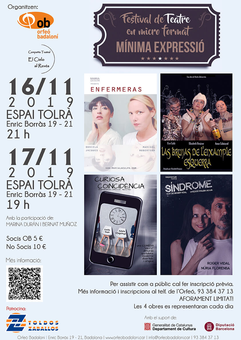 Aquest cap de setmana, dissabte a les 21h i diumenge a les 17h, la companyia teatral “El Cielo al Revés”, vinculada a l’Orfeó Badaloní, oferirà un nou festival de teatre en micro format, a l’Espai Tolrà de l’Orfeó, amb actuacions de diverses companyies teatrals dedicades aquest gènere vingudes des de diverses poblacions catalanes.