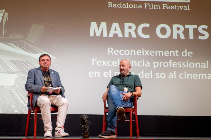 Marc Orts, tècnic de so cinematogràfic, ha rebut avui a la tarda un reconeixement especial de FILMETS “per la seva excel·lència professional en el món del so al cinema”. El director general de Badalona, Xavier Casanovas, ha lliurat una placa commemorativa a Marc Orts, que ha guanyat durant tota la seva carrera professional 7 premis Goya al millor so i 7 premis Gaudí. Marc Orts ha treballat amb els millors directors espanyols i internacionals dels últims 25 anys com Jaume Balagueró, Juan Antonio Bayona, Pedro Almodóvar o Alejandro Amenábar, entre d’altres. Aquest homenatge s’ha fet en el marc de la sessió Campus. Des de l’escenari del Teatre Zorrilla, Marc Orts ha mantingut un col·loqui sobre el seu treball al món del cinema amb el director artístic del festival, Agustí Argelich, i amb els estudiants que omplien de gom a gom el teatre.
