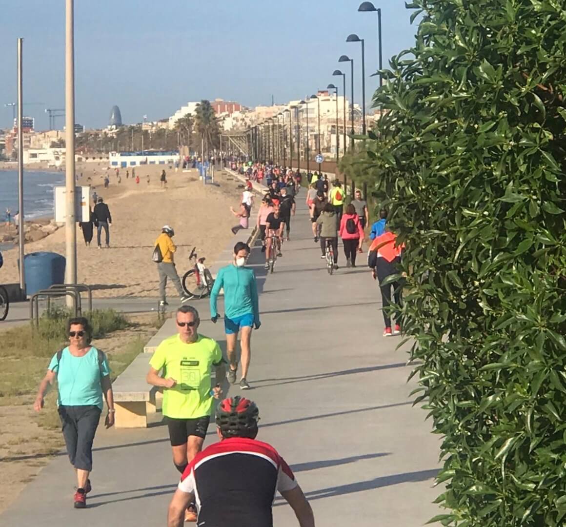 Des de dissabte, de 6h a 10h del matí i de 20h a 23h, els ciutadans que ho volen poden sortir a passejar o bé a fer esport. El passeig marítim de Badalona, des del primer dia, s’ha convertit en la zona de la ciutat amb més afluència de gent. De fet, en alguns punts com la zona de la platja de la Barca Maria o al voltant de l’estació de tren la distància de seguretat és impossible de mantenir, sobretot entre les 9h i les 10h del matí i les 20h i les 21h del vespre, segons ha pogut comprovar durant els darrers dies aquest mitjà. De fet, rius de gent també accedeixen, sense cap mena de control, pels passos subterranis per creuar la via del tren. Al passeig marítim, corredors, patinadors, ciclistes i passejants omplen tot l’espai. Algunes persones que hi passegen han mostrat la seva preocupació per la gran quantitat de persones que s’hi passegen, però també perquè molts ciclistes, molts d’ells amb grups, circulen a gran velocitat. Una altra queixa també és la poca presència policial al llarg del passeig. De fet, en alguns punts de la platja de Badalona s’han vist a grups de persones fent festes alcohòliques o festes d’aniversari a la platja. Molts esportistes tampoc respecten la prohibició de fer esports col·lectius, com el vòlei.