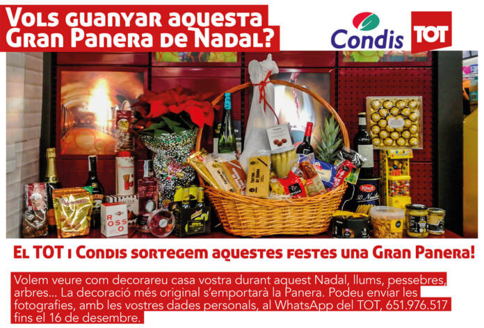 Aquestes festes, la revista El TOT Badalona i Condis sortejaran una Panera de Nadal entre els lectors del nostre setmanari. Aquestes festes volem que ens envieu, via el WhatsApp del TOT, 651.976.517, les vostres fotos de les decoracions nadalenques a casa vostra. Les imatges han de ser d’arbres, pessebres, llums, ornaments. Les fotografies més originals seran publicades a l’edició de paper del nostre setmanari i un jurat triarà la més original que s’emportarà aquesta Panera de Nadal. Podeu enviar les vostres fotografies, via WhatsApp, fins al dilluns 16 de desembre. El guanyador/a es donarà a conèixer a l’Especial de Nadal del TOT, el divendres 20 de desembre. La Panera s’exposa al Condis del carrer Guifré, 100.