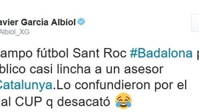 El tercer tinent d’alcalde de Badalona, José Téllez, posarà en coneixement de la fiscalia especialitzada en delictes d’odi el contingut de la piulada que va fer dimecres el líder del PPC, Xavier Garcia Albiol. En la seva publicació a Twitter, Albiol explicava que els assistents a un partit de futbol amateur a Badalona van intentar “linxar” un assessor del seu partit perquè “el van confondre amb el regidor de la CUP que va desobeir”, en clara al·lusió a Téllez. El dirigent popular acompanyava la piulada d’una cara somrient. Téllez denuncia que Albiol “banalitzi uns fets especialment violents i perillosos, com és l’intent de linxament a un càrrec electe pel simple fet de tenir una ideologia concreta”.