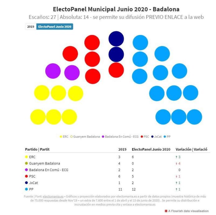 El web https://electomania.es/ dedicada a enquestes electorals ha posa’t l’atenció en l’actualitat municipal de 14 municipis espanyols. Una d’aquestes ciutats triades, l’única de Catalunya, ha estat Badalona. Un any després de les eleccions municipals del 2019, i a tres anys de les properes municipals, s’ha volgut fer una enquesta sobre Badalona. A l’estudi han participat unes 75.000 persones, 7.600 entre l’1 d’abril i el 15 de juny, segons ha informat https://electomania.es/epmunicipal2020/. Si ara se celebressin eleccions municipals, i sempre segons l’enquesta d’electomanía, Guanyem podria perdre els 4 regidors actuals i quedar-se sense representació a l’Ajuntament de Badalona. Dels 4 regidors actuals passaria a 0. ERC, en canvi, passaria dels 3 actuals als 6, el doble de representació actual. Per la seva part, el PP guanyaria un regidor, 12, i li faltaria 2 regidors per la majoria absoluta. El PSC perdria un regidor, i dels 6 actuals passaria a 5. Destaca Junts per Catalunya que passaria de l’actual regidor a 2. Per acabar, En Comú Podem mantindria els 2 regidors actuals.