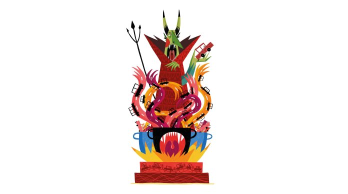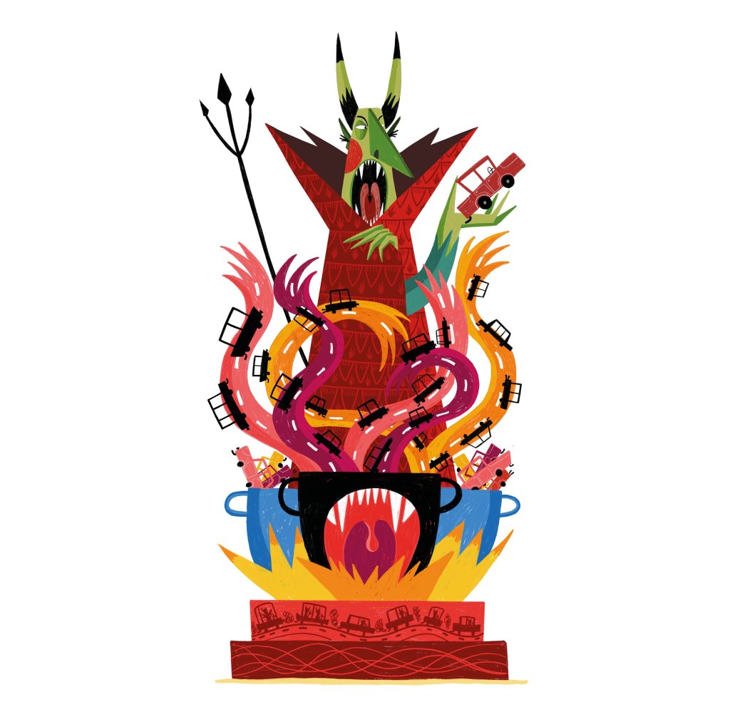 La figura presenta un dimoni ple de cotxes que, atès que aquest any Badalona serà Zona de Baixes Emissions en compliment de la normativa europea i estatal pot tenir, segons la mateixa autora del disseny, dues interpretacions: “un dimoni enfadat amb la mesura enviant més cotxes a la ciutat o un dimoni emportant-se els cotxes que no compleixin amb la nova normativa”.