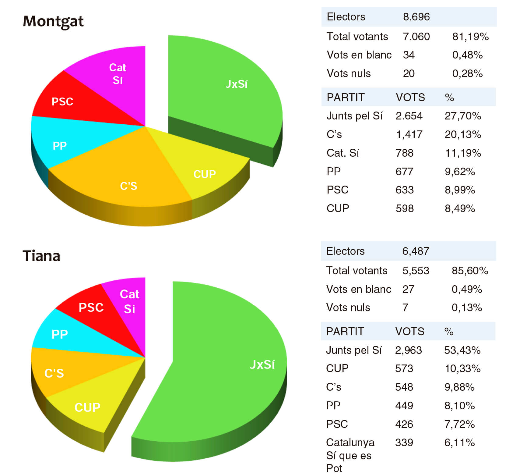 A Montgat, Junts pel Si s’ha convertit en la força més votada amb una participació del 81,19%. La formació independentista obté el 37% dels vots. La segona força més votada a Montgat ha estat Ciutadans, amb un 20% dels vots, seguida de Catalunya si que es pot, amb un 11%. A Tiana, Junts pel Si ha estat la formació més votada amb un 53% dels vots