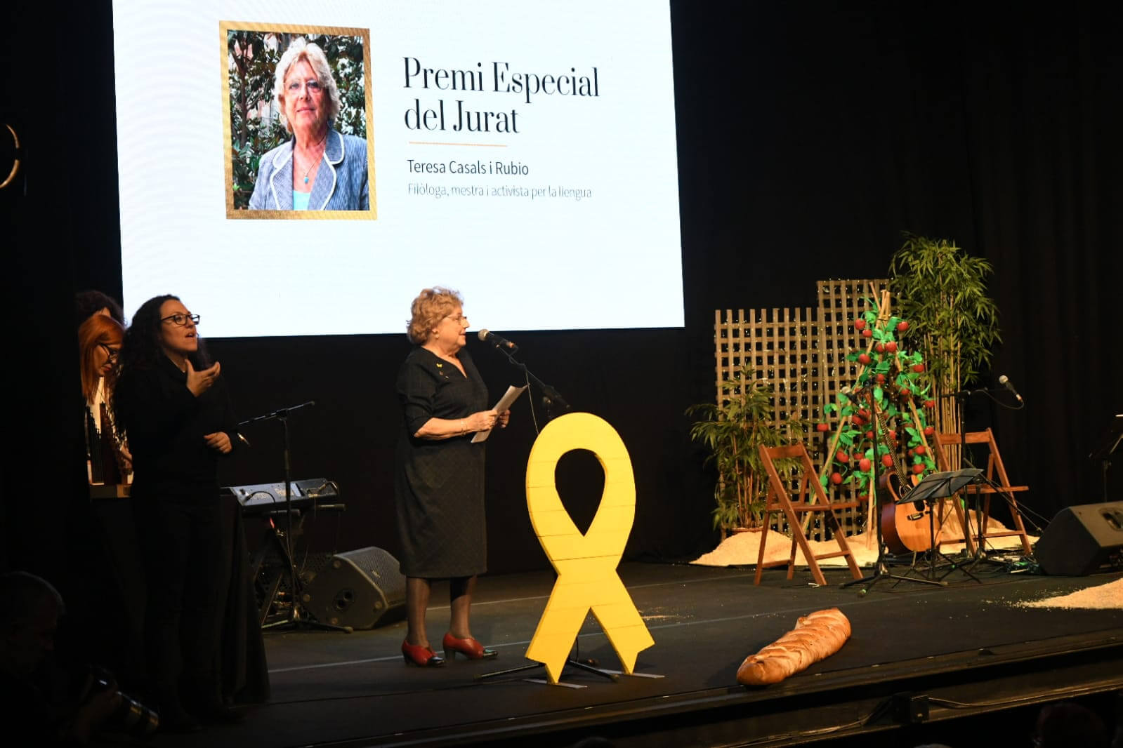La badalonina, Teresa Casals, durant el seu discurs, s’ha definit com una enamorada del català, en concret, ha assegurat que “és un enamorament d’aquells que fa patir”, perquè, afirma que “el català, una llengua d’abast mitjà és una llengua estructurada, moderna, que pot respondre a tots els registres però que té un estat que, no només no la defensa sinó que legisla per minimitzar-la”. La guanyadora del Premi Especial ha acabat animant a tothom a ser voluntaris per la llengua per “defensar que el català sigui la llengua comuna i de cohesió social a casa nostra”.