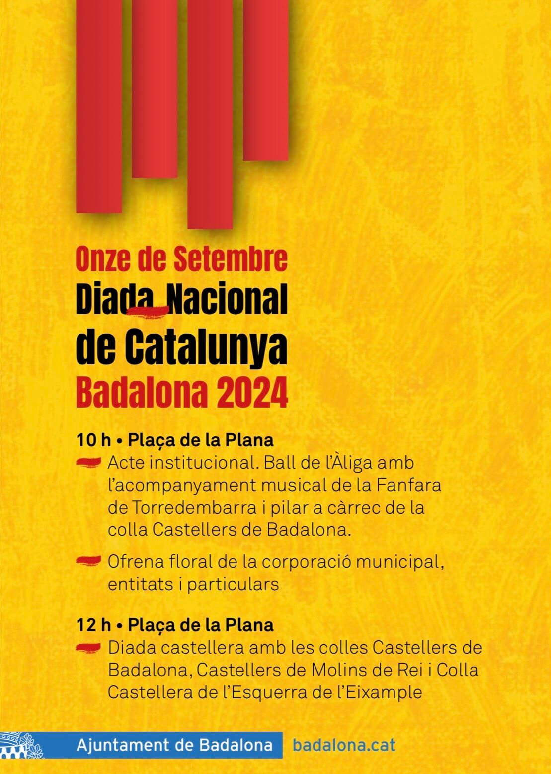 Badalona seguirà la línia dels darrers anys en els actes institucionals de la Diada Nacional de Catalunya, 2024. Els actes començaran a les 10h, a la Plana, amb un acte institucional, com és tradicional. El ball de l’Àliga, amb l’acompanyament musical de la Fanfarra de Torredembarra, donarà pas a un pilar dels Castellers de Badalona. A continuació començarà l’Ofrena Floral de la corporació municipal, d’entitats i particulars. A les 12h, a la mateixa Plana, tindrà lloc la diada castellera amb la colla micaco i els castellers de l’Eixample.
