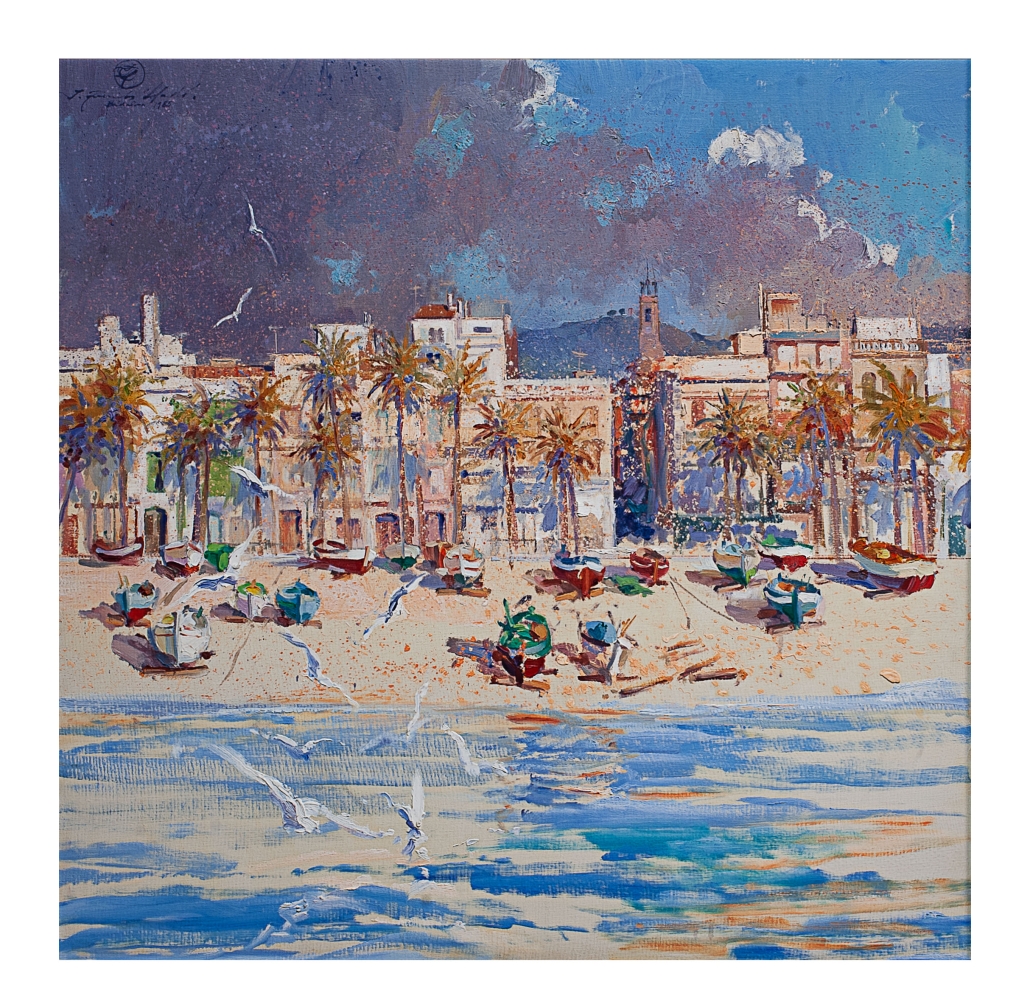 El quadre, una pintura a l’oli de 115 x 115 cm, és una vista de la Rambla de Badalona des del mar, en què es veu, també, el campanar de Santa Maria i la serralada.
