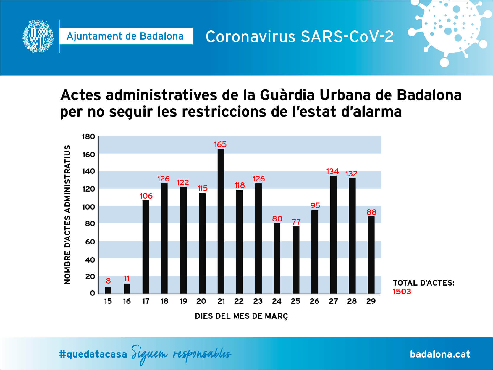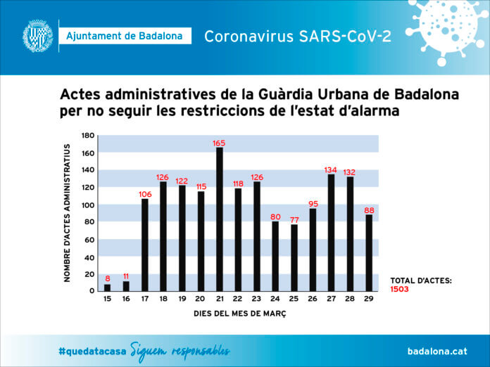 La Guàrdia Urbana de Badalona ha aixecat 1.503 actes administratives a persones que incomplien les mesures acordades pel Real Decret 463/2020, de 14 de març, pel qual es declarava l’estat d’alarma per a la gestió de la situació de crisi sanitària ocasionada per la pandèmia de la COVID-19.