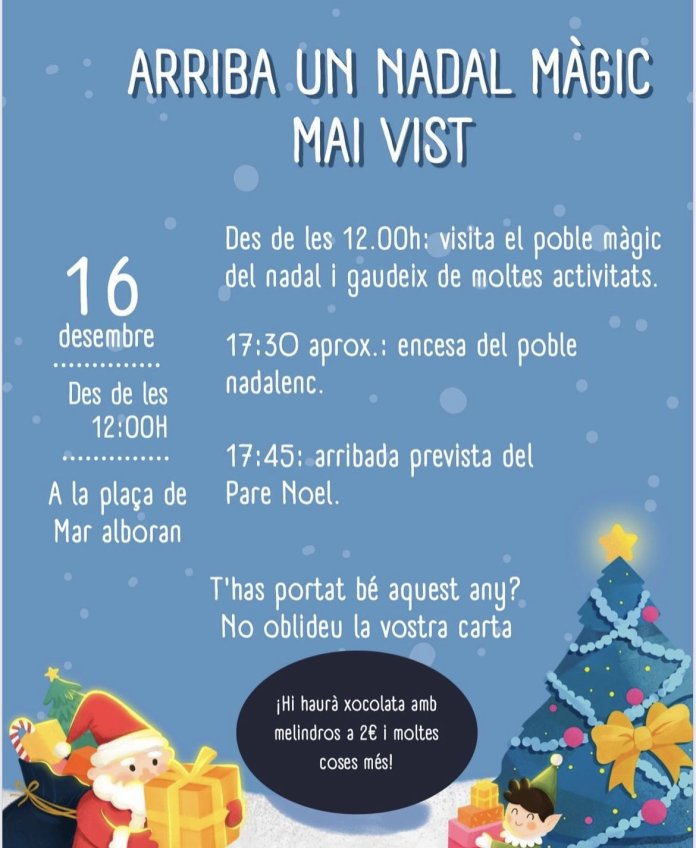 L’AV del barri de la Mora tindrà, per primera vegada, un poblet de Nadal fets pels mateixos veïns. Serà el dissabte 16 de desembre, des de les 12 del migdia, a la plaça de Mar Alborán. L’hora més especial, però, serà a les 17:30h, amb l’encesa del poble nadalenc i la visita del Pare Noel, on els infants podran donar-li les seves cartes. A més, es podrà degustar xocolata amb melindros.