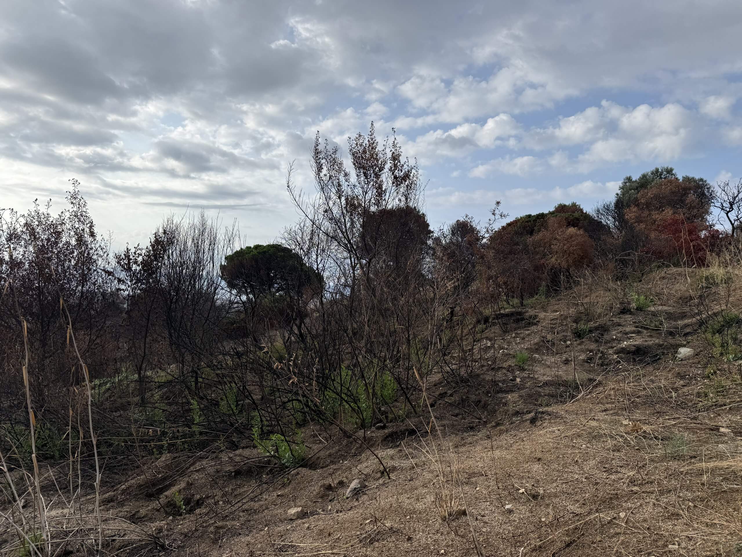Amb el pas de les setmanes i les pluges de juliol, comencen a aparèixer brots verds entre les restes de cendra i terra erosionada.