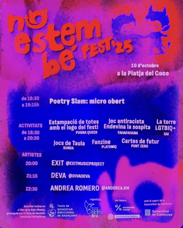 A partir de les vuit del vespre, arribarà el torn de la música en directe amb els concerts de EXIT (20.00 h), DEVA (21.15 h) i Andrea Romero (22.30 h), que tancarà la jornada amb un punt de festa i connexió comunitària. L’esdeveniment està organitzat per l’Ocell de Foc BCN Nord, amb la col·laboració de l’Ajuntament de Badalona, Economia Social, i el suport de la Generalitat de Catalunya. Amb el lema “Celebrem-nos, encara que incomodi”, el No estem bé fest vol convertir la platja del Coco en un espai per expressar-se, compartir emocions i trencar el silenci al voltant de la salut mental.