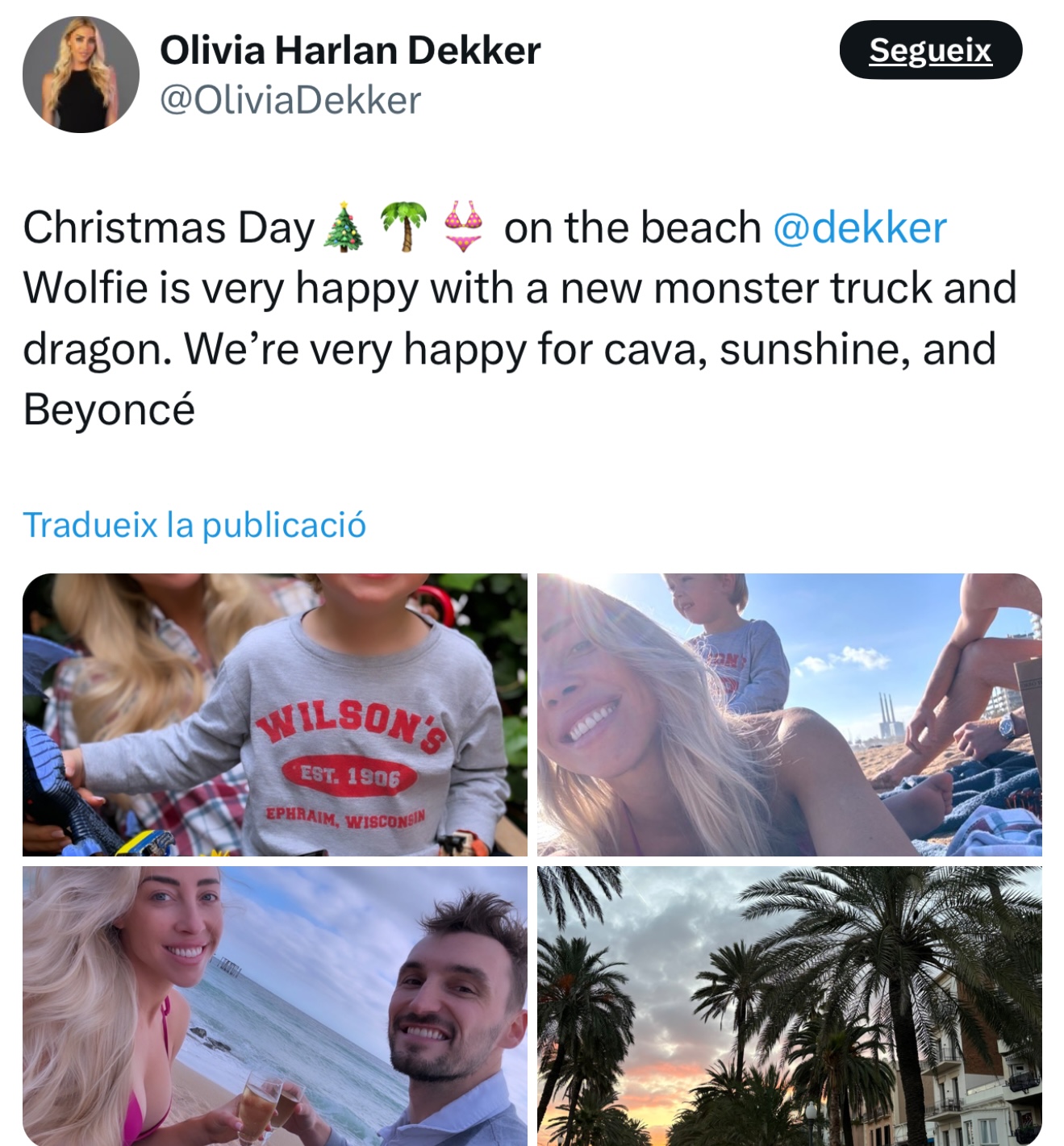 La coneguda periodista esportiva nord-americana Olivia Harlan, coneguda per la seva tasca a ESPN i la NBA, ha passat aquest Nadal a Badalona i ha compartit la seva experiència a través de les xarxes socials. Harlan, que és parella del jugador del Club Joventut Badalona, Sam Dekker, ha publicat diverses imatges a Instagram on es poden veure llocs emblemàtics de la ciutat, com la Rambla i la platja de Badalona.