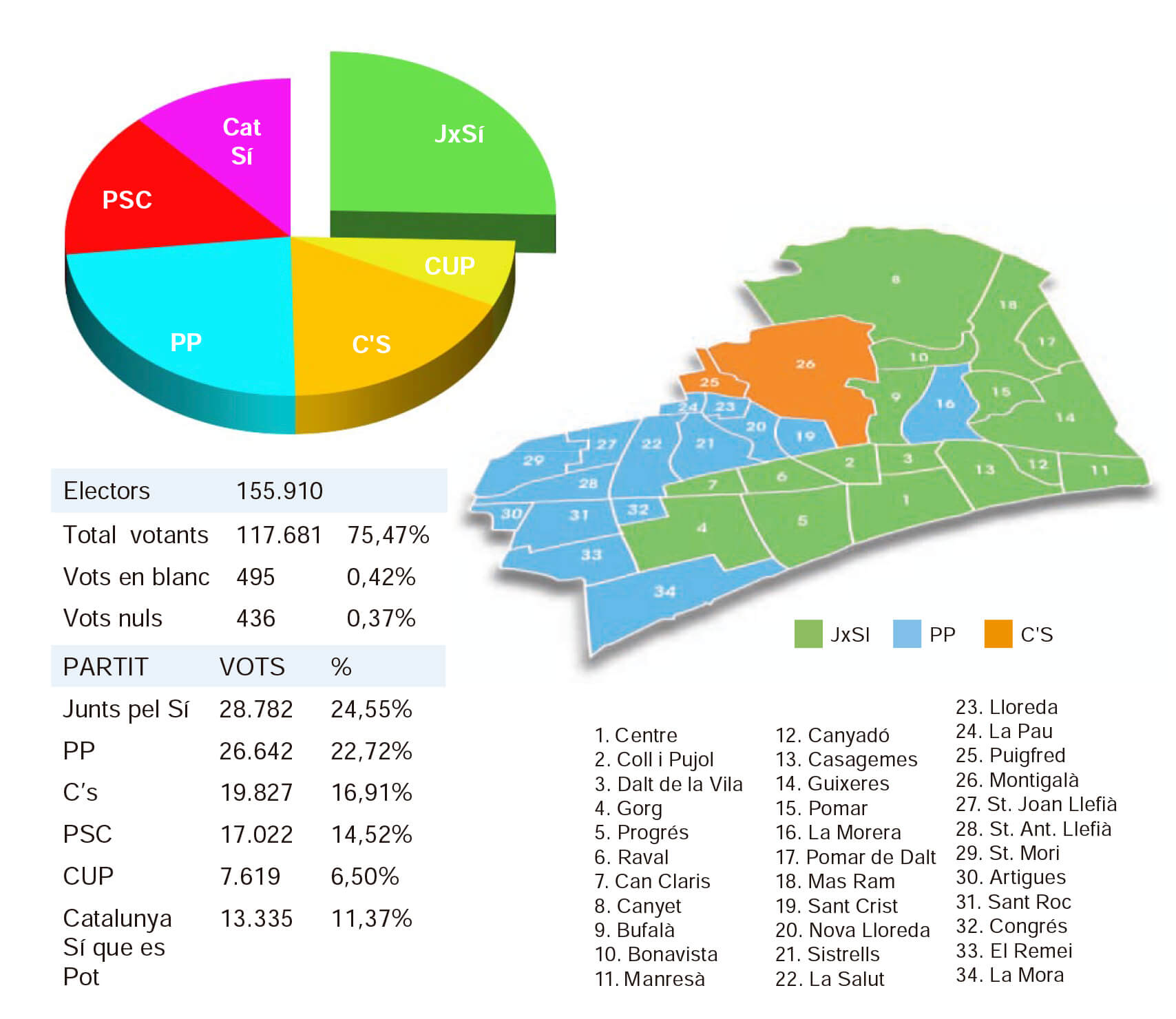 posició. Des de la secció local creuen que ser virà per fer front al bloc independentista. Des del PSC, van assegurar que tot i perdre la primera posició, respecte a fa tres anys, els resultats demostren uns símptomes d’una cer ta recuperació del partit a nivell municipal. On hi havien cares llargues era a la seu d’ICV. Des de Catalunya Sí que es Pot van valorar negat ivament els resultats aconseguits a la ciutat, tot i que la formació d’esquerres va guanyar uns 300 vots respecte al resultat d’ICV del 2012. Per a la CUP de Badalona, els resultats confirmaven que havien estat unes eleccions plebiscitàries i es mostraven decidits a posarse a treballar en aquest sentit. La CUP valorava positivament els resultats a la ciutat. Per últim, des d’Unió, van assegurar que aquesta campanya havia estat marcada pels que es mostraven a favor o en contra de la independència. Unió va agrair els més de