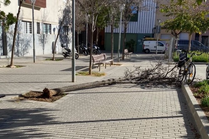 El fort vent va deixar algunes petites destrosses a la via pública, com arbres caiguts o pancartes arrencades