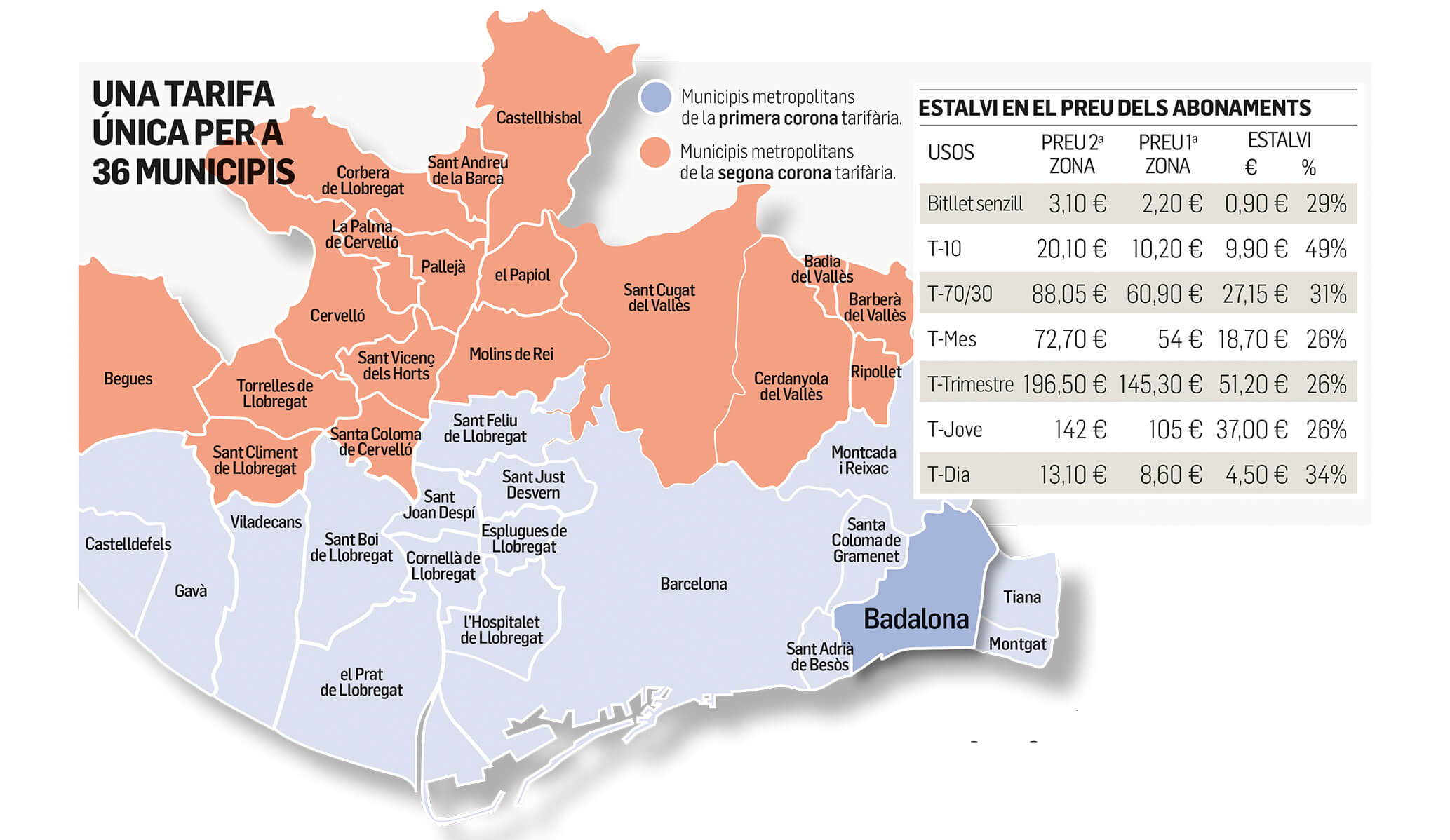 Viatjar entre Badalona i els municipis metropolitans de la segona corona tarifària pot costar fins a la meitat el 2019. A partir de gener, s’implanta la tarifa plana metropolitana de transport públic a la Metròpolis Barcelona, que permetrà desplaçar-se per tota la metròpolis a preu d’una zona. Aquesta tarifa plana inclou també 6 municipis metropolitans del Vallès occidental i 12 municipis metropolitans més del Baix Llobregat. Tots ells, tot i estar dins de l’àrea metropolitana, formen part de segona corona tarifària.