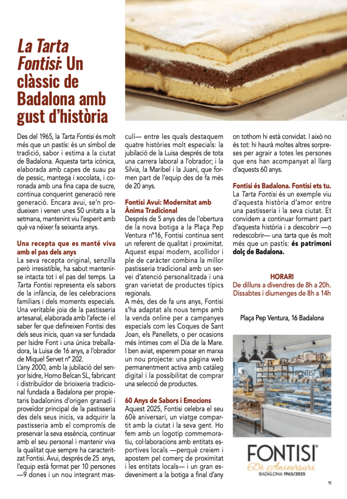 Des del 1965, la Tarta Fontisi és molt més que un pastís: és un símbol de tradició, sabor i estima a la ciutat de Badalona. Aquesta tarta icònica, elaborada amb capes de suau pa de pessic, mantega i xocolata, i coronada amb una fina capa de sucre, continua conquerint generació rere generació. Encara avui, se’n produeixen i venen unes 50 unitats a la setmana, mantenint viu l’esperit amb què va néixer fa seixanta anys.
