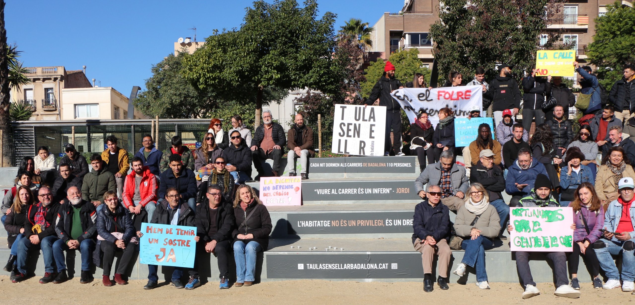 Les entitats socials de la Taula Sense Llar de Badalona, persones acompanyades per aquestes entitats i altres ciutadans/es s’han aplegat a la Plaça Pompeu Fabra, aquest dijous, amb motiu del Dia Mundial de les Persones Sense Llar. L’objectiu és sensibilitzar sobre la problemàtica del sensellarisme i posar en relleu que la manca d’habitatge crea exclusió i desigualtat.