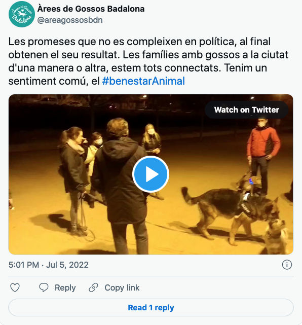 Des de l’Ajuntament de Badalona asseguren que s’està treballant en la instal·lació d’una platja per a gossos. Ara per ara només falta trobar el millor espai dins del litoral badaloní. Després de la protesta i la recollida de signatures que hi va haver per part dels veïns i veïnes del barri de la Mora de Badalona, on demanaven que no s’instal·lés un espai per a gossos a la platja de la Marina, l’Ajuntament de Badalona està elaborant un pla per a trobar la millor solució per a totes les parts. Des de l’agrupació ‘Àrees de gossos Badalona’, on reivindiquen el benestar animal i els espais per als gossos, van destacar en una piulada a Twitter, amb relació a la col·locació d’una platja per a gossos a Badalona: “Les promeses que no es compleixen en política, al final obtenen el seu resultat. Les famílies amb gossos a la ciutat d’una manera o altra, estem tots connectats. Tenim un sentiment comú, el #benestarAnimal”.