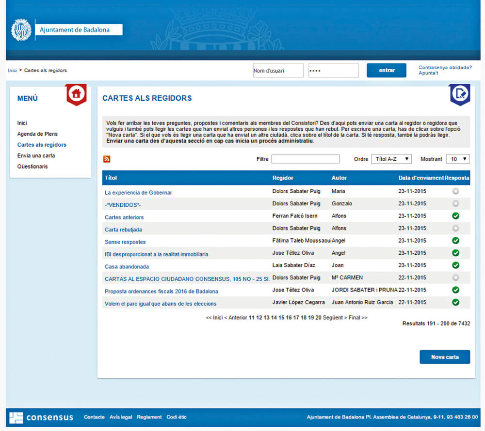L’Ajuntament de Badalona té un servei, a través d’internet, que permet al ciutadà fer arribar les seves queixes, reclamacions o comunicacions. El Consensus sembla que no acaba de funcionar dins l’engranatge del govern local. Una prova d’això és la quantitat de cartes sense resposta que troben en aquest servei on line. Tot i que hi ha regidors que responen en pocs dies, com el regidor de Via Pública Javi López o Laia Sabater de l’Àmbit de Badalona Educadora, hi ha d’altres que fa setmanes i fins i tot mesos que no responen a cap carta. L’alcaldessa de Badalona, Dolors Sabater, fa tres mesos que no respon cap comunicació amb el ciutadà, la darrera és del 20 de novembre de l’any passat, ara fa tres mesos. A l’alcaldessa se li acumulen més d’una quarantena de cartes sense resposta. Altres regidors, com l’Oriol Lladó d’Urbanisme, fa un mes que no contesta cap carta i té més d’una desena de cartes sense respondre. Alguns ciutadans s’han queixat d’aquesta manca de resposta al mateix servei de Consensus.