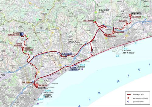 Amb la connexió amb Montgat, el servei tindrà un total de 10 parades d’anada i 8 de tornada. A Alella, el bus té parada a Guilleries i a Can Lleonart. A Teià en té dues parades (a la plaça de l’1 d’Octubre i a la rotonda de Vallbellida) i una al Masnou (a l’avinguda de Joan XXIII). A Badalona, a més de Can Ruti, també hi ha parada a l’Institut Guttman, a la residència per a disminuïts psíquics Can Ruti, al carrer del Germà Juli-Prim (al costat dels jutjats) i al CAP Dr. Robert-President Companys.