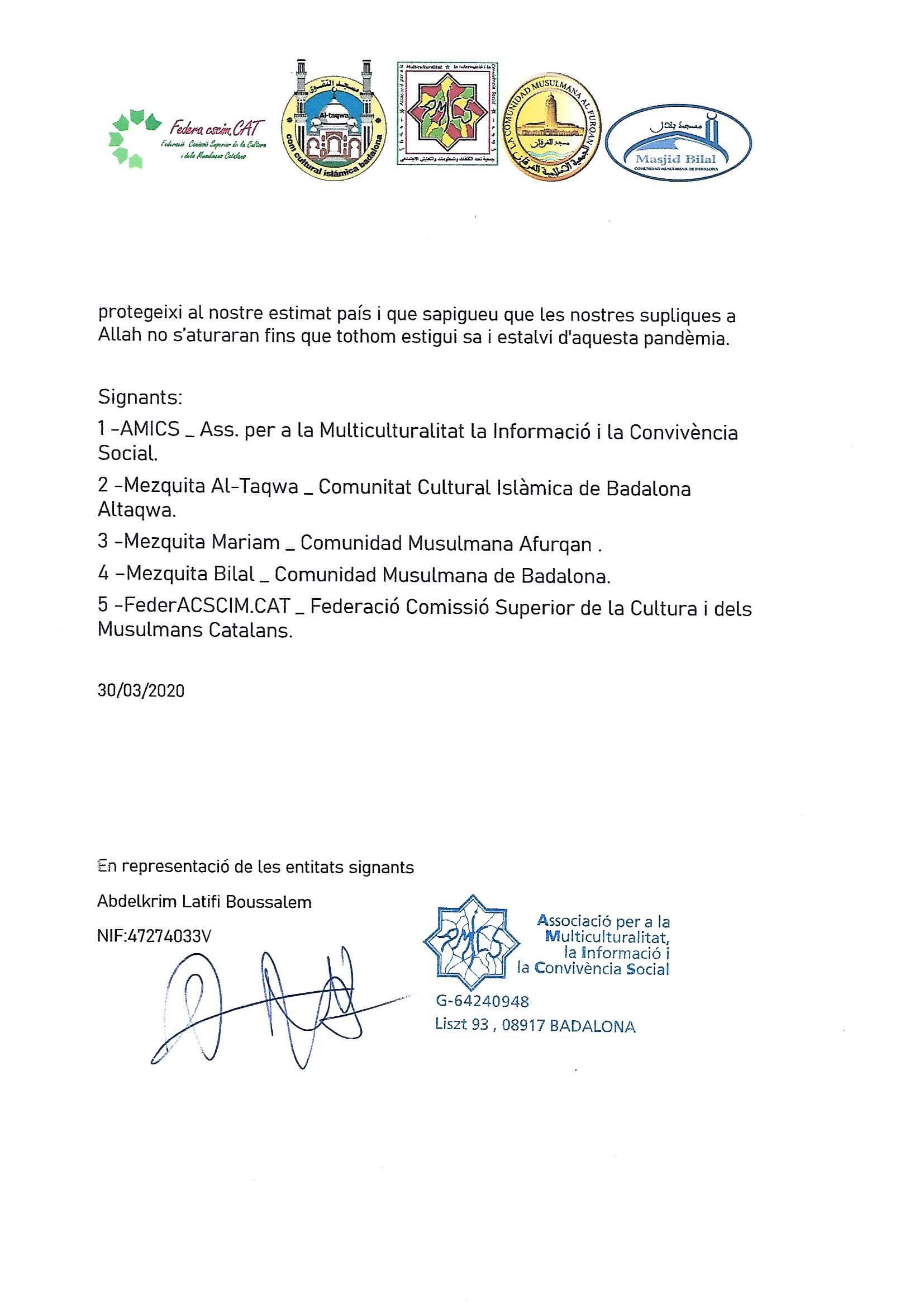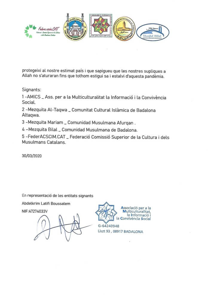 Diverses comunitats musulmanes de la ciutat de Badalona s’han dirigit en una carta a l’alcalde de Badalona, Álex Pastor, per fer costat a tota la ciutat fen oracions contra aquesta pandèmia. A la carta, la comunitat explica que els musulmans de Badalona aixequen les mans i braços per fer súpliques a Allah (Déu) perquè elimini de la ciutat de Badalona, Catalunya, Espanya i el món sencer aquesta pandèmia. Recorden i demanen que es facin oracions en cada una de les pregàries perquè Allah protegeixi a tothom. La comunitat també expressa que “estem tristos i dolguts per tot el que està passant, que és molt dur, per això presentem els nostres condols a les famílies que han perdut algun dels seus éssers estimats. També supliquem a Allah que es curin els malalts i que es recuperin aviat tots els infectats d’aquest virus”. A més, detallen que les entitats islàmiques culturals i religioses de Badalona, i els seus membres, ofereixen tots els seus voluntaris, els recursos i les instal·lacions perquè les autoritats públiques, en cas de qualsevol necessitat, les puguin utilitzar com creguin convenient.