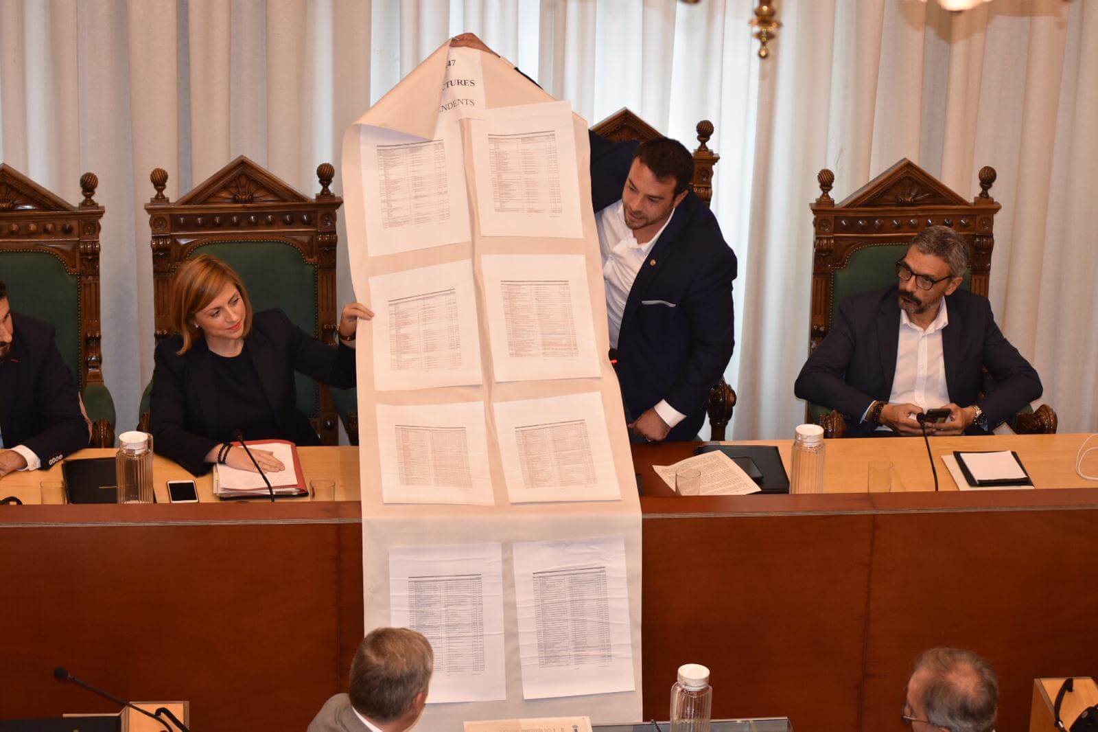 La foto del ple va arribar al darrer minut. L’alcalde, Àlex Pastor, va treure tot un seguit de fotocòpies, els quals contenien les 1.147 factures pendents de pagament que va deixar el govern anterior, totes elles corresponents a aquest mateix any 2018, segons va explicar l’alcalde socialista.