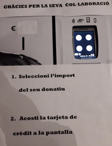 Els feligresos de l’Església de Sant Josep de Badalona ja poden fer donacions amb targeta mitjançant el sistema ‘contactless’ que ha instal·lat a la porta de la parròquia. Aquest nou sistema, que està en funcionament des de fa poques setmanes, té l’objectiu de donar una via més per fer arribar les donacions a l’església. El sistema permet seleccionar la quantitat a donar com a almoina, i es pot pagar només acostant-hi la targeta, com un datàfon. s’accepten targetes de crèdit i dèbit de qualsevol banc. A més, el mateix aparell també manté el mètode tradicional i té un forat per a fer donacions en efectiu.